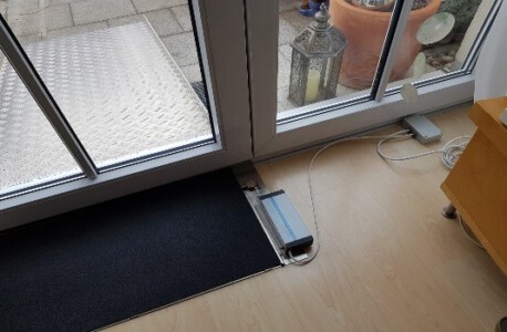 Wir bieten Ihnen unterschiedliche Varianten für unterschiedlich zu überbrückende Höhen an. Die Bauhöhe im Drehbereich der Terrassentür beträgt 20 mm. Die elektrischen Rollstuhlrampen werden ausschließlich mit einem elektrischen Antrieb, der über eine Fernbedienung bedient wird, vertrieben. Die Antriebe werden vorwiegend auf der Griffseite der Terrassentür platziert. Diese können stehend oder aber flach liegend auf der Bodenplatte der Einheit montiert werden. Die Einheiten werden von der Innenseite ohne bauliche Maßnahmen gegen den Blendrahmen der Tür mit Klettband fixiert.