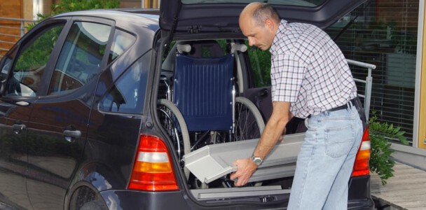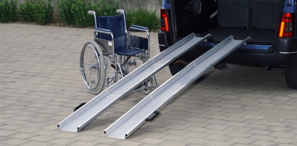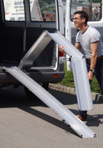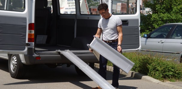 Besonders bei geringem Stauraum im Fahrzeug bietet die dreifach faltbare ABS-Z Schiene die optimale Lösung. Diese Aluminium-Auffahrhilfen, die aus einem Strangpressprofil hergestellt werden, bieten ein ideales Verhältnis zwischen Eigengewicht und Belastbarkeit. Mit einer Innenbreite von 150 mm sind sie sehr gut geeignet, um auch von Rollstühlen mit unterschiedlichen Spurbreiten.