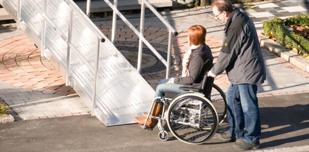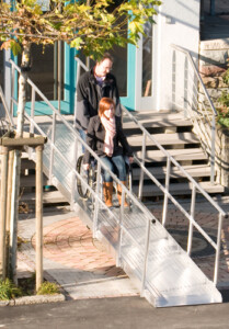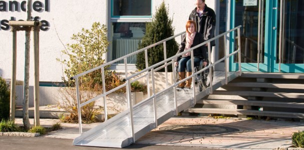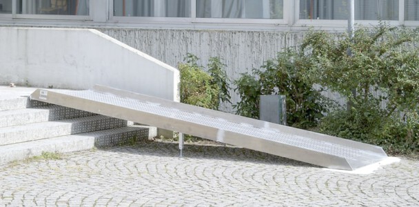Die Rollstuhlrampe AOL-R dient in erster Linie zum überbrücken von Treppen und hohen Absätzen. Durch eine spezielle Stanzung der Fahrfläche wird eine hohe Rutschsicherheit gewährleistet und durch die Lochung kann Regen, Schnee und Schmutz schnell entweichen. Andere Abmessungen auf Anfrage.